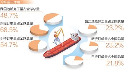 今年前三季度,我国造船完工量、新接订单量和手持订单量以载重吨计分别占全球总量的48.7%、68.5%和54.7%,均居世界第一。在江苏泰州靖江市,当地造船企业的订单排到了2026年,成为我国船舶业转型升级、稳步向好的缩影。