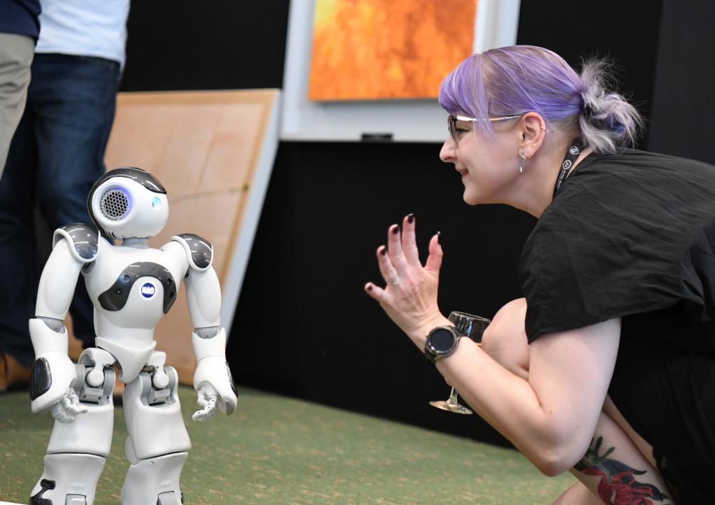 7月7日,在瑞士日内瓦“人工智能造福人类全球峰会”上,一名参会者与机器人互动。新华社记者连漪摄