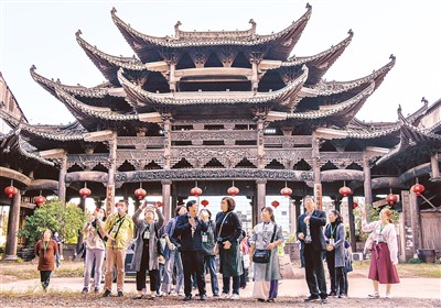 图为参加“2023年海外华文教师研习班(安徽)”的华文教师在安徽省黄山市歙县郑村镇棠樾村参观。黄山学院供图