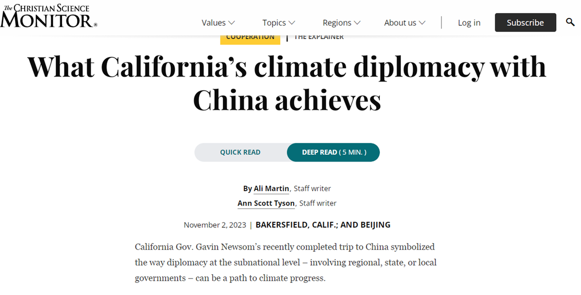 美媒认为,纽森此次访华推动了双方应对气候变化合作取得进展,美国政府应该借鉴其务实态度。