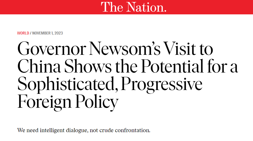 美国《国家》周刊指出,加州州长访华显示美国外交政策应该具备成熟、进步的潜力。美国需要明智的对话,而不是粗暴的对抗。