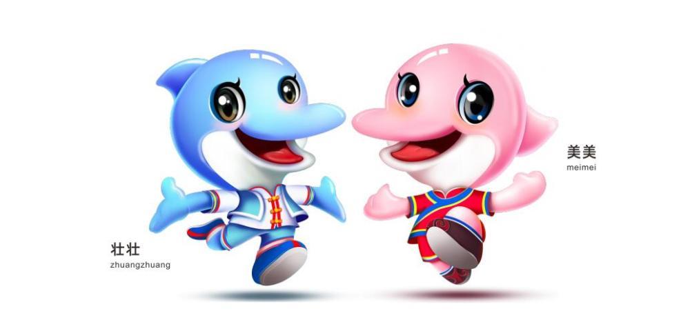 首届学青会吉祥物“壮壮”“美美”,是一对活泼律动的海豚形象,以中华白海豚为原型创作,搭配壮锦和民族服饰,凸显广西的民族特色和地域风格。