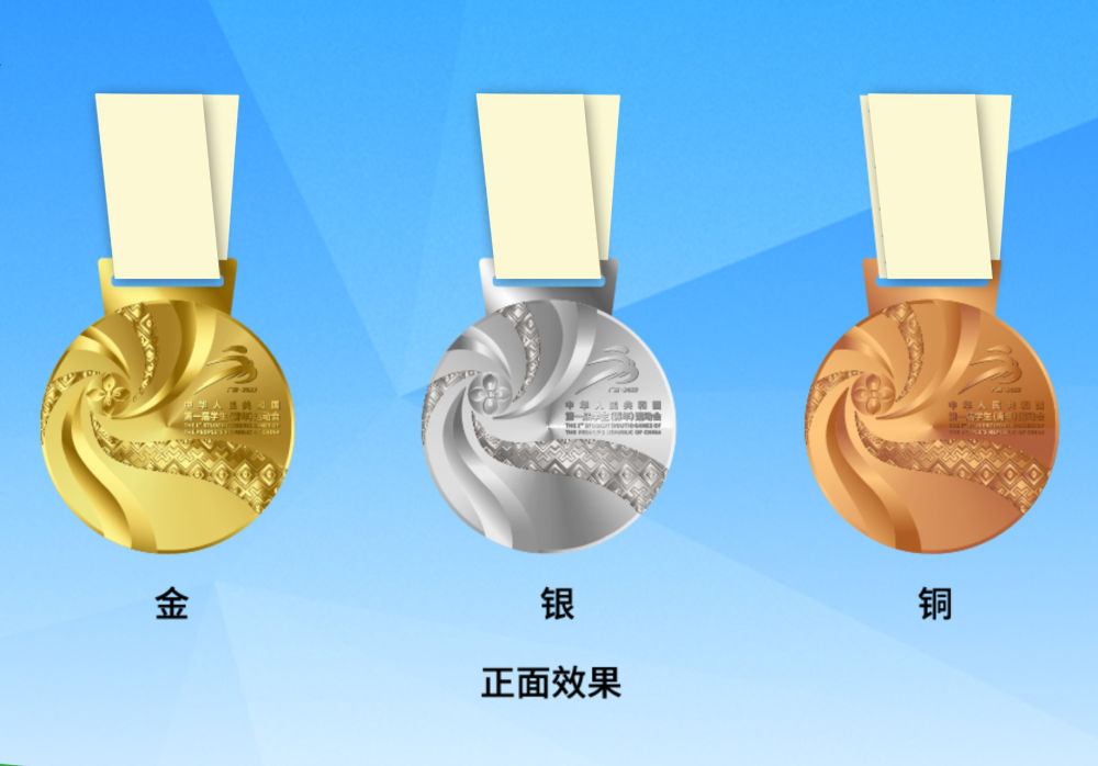 首届学青会奖牌正面采用绣球、壮锦等广西元素,以绣球为设计焦点,通过壮锦飘带向外绽放,如一朵盛开的鲜花,表达欢迎四方友人共赴学青盛会的美意;奖牌背面以广西铜鼓鼓面为原型,中心太阳纹象征着年轻人的活力和热情,四方配以图腾鸟,有着吉祥的寓意;外圈环绕了学青会的英文名称和铜鼓经典纹饰云雷纹。奖牌整体寓意“团结、活力、绽放”。