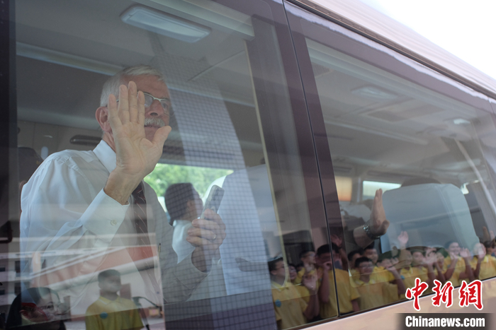 图为临别时,代表团成员与学生挥手告别。 中新社记者 刘俊聪 摄