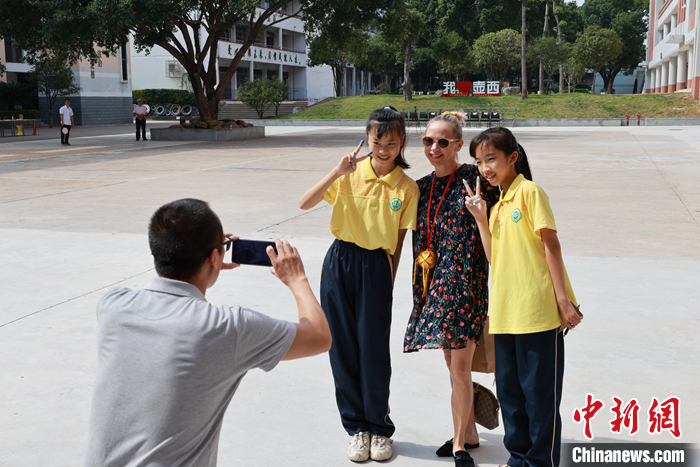 图为飞虎队后代与学生合影留念。 中新社记者 林馨 摄