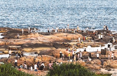 游客在海南环岛旅游公路文昌段途经的木兰湾游玩。新华社记者 蒲晓旭摄