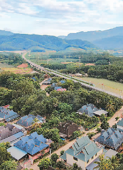 云南省景洪市勐罕镇,中老铁路上的动车从傣族村寨旁驶过。新华社发
