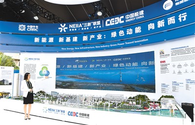 博鳌亚洲论坛2023年年会上,中国能建参展人员介绍“新能源 新基建 新产业:绿色动能 向新而行”展台。新华社记者 杨冠宇摄