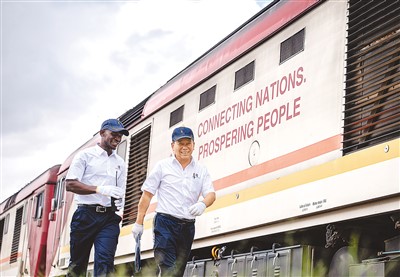 在肯尼亚内罗毕,非洲之星铁路运营公司机辆部的火车驾驶员(右)与学员从蒙内铁路机车旁走过。新华社记者 王冠森摄