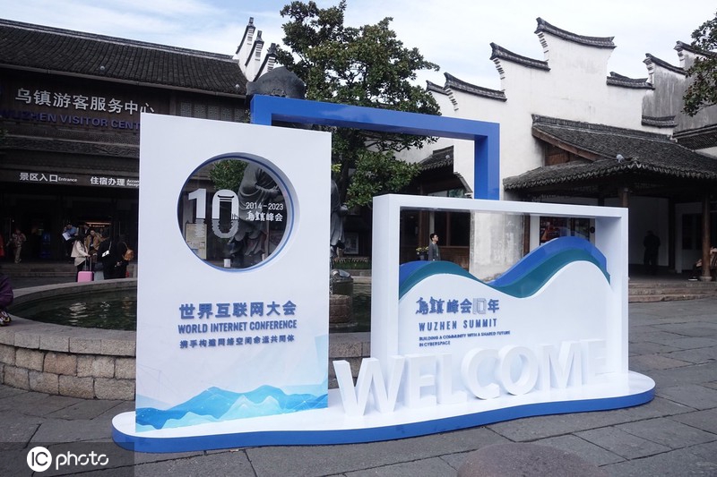 2023年11月6日,世界互联网大会相关展示牌放置在乌镇西栅景区。(图/东方IC)