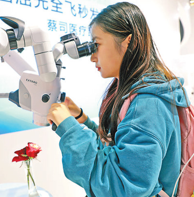 在蔡司集团展台,一名参观者正在体验手术显微镜。