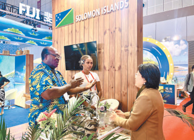 在第六届进博会的所罗门群岛国家馆,展台工作人员向观众介绍当地旅游产品。本报记者 俞懿春摄