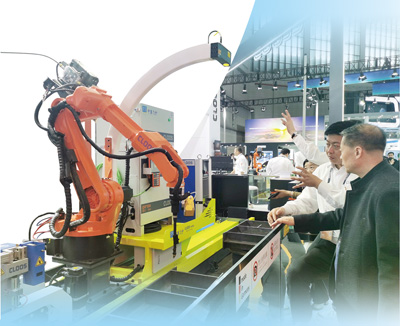 在一家德国企业展台,工作人员在讲解紧凑型机器人工作站的功能。本报记者 王 远摄
