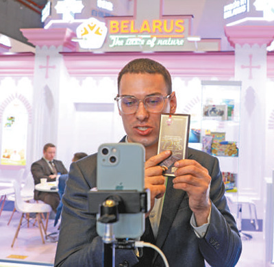 白俄罗斯参展商在进行网络直播。本报记者 赵益普摄