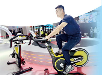在消费品展区,一家健康科技品牌商正在演示动感单车。本报记者 王 芳摄