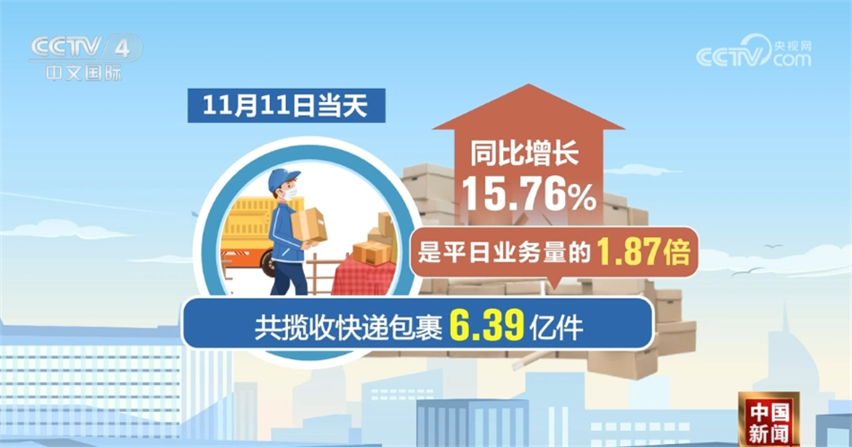数据显示,11月1日至11日,全国邮政快递企业共揽收快递包裹52.64亿件,同比增长23.22%,日均业务量是平日业务量的1.4倍。其中11月11日当天,共揽收快递包裹6.39亿件,是平日业务量的1.87倍,同比增长15.76%。