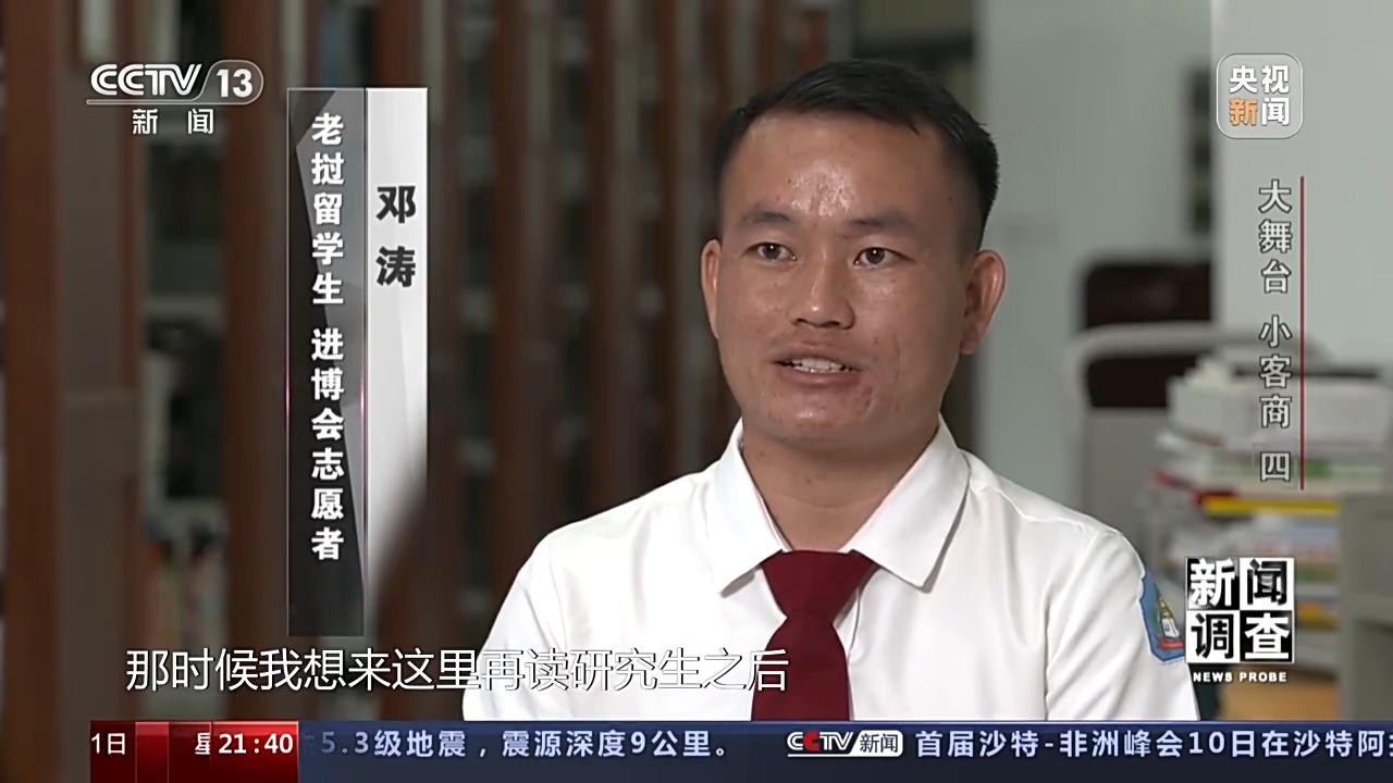 邓涛在上海的学费和生活费均由中方提供的奖学金支付,但他过得很节俭,舍不得花钱到处游玩,能够成为进博会的志愿者对他来说是一次免费增长见识的绝好机会。