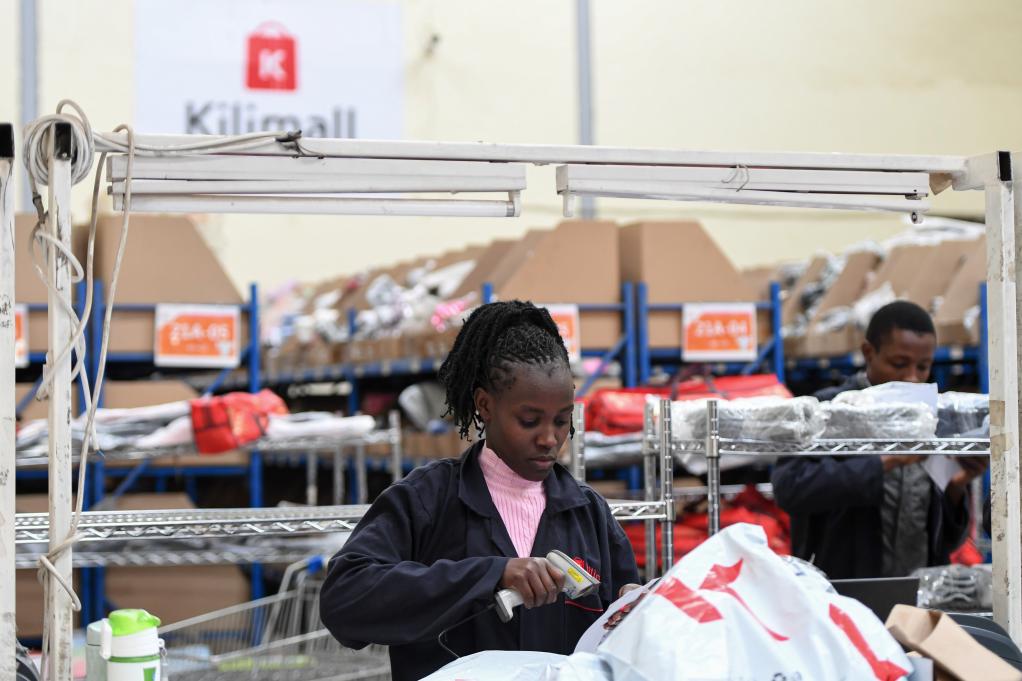 2023年7月28日,在肯尼亚姆洛隆戈,湖南长沙非拓信息技术有限公司旗下电商平台Kilimall的员工在仓库内分拣货物。新华社记者李亚辉摄