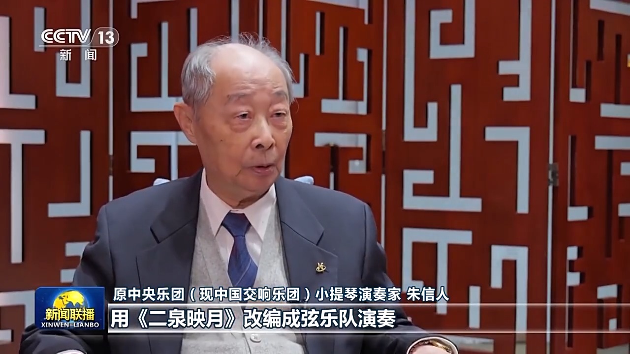 原中央乐团(现中国交响乐团)小提琴演奏家朱信人:1973年我们是用《二泉映月》改编成弦乐队演奏,他们听了以后非常喜欢这首作品,当场就要总谱,他们准备演。他们也看了我们的乐器,有的当场就把自己的小号送给我们了。音乐大家都是融合的。