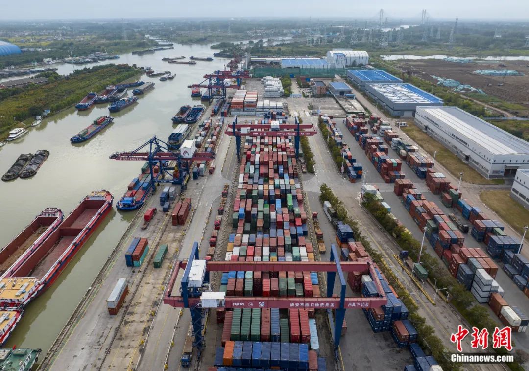 2023年10月7日,京杭大运河江苏省淮安市新港集装箱码头一派忙碌景象。贺敬华 摄