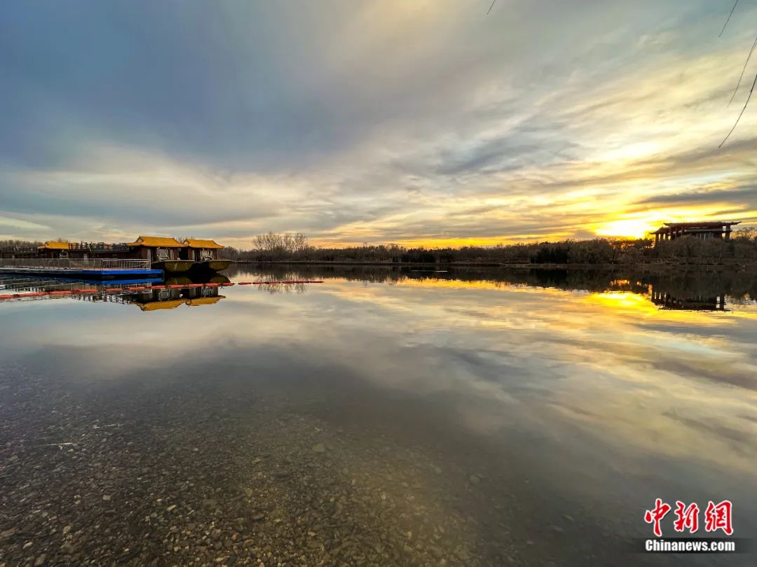2022年12月11日,夕阳映照大运河,北京通州大运河森林公园里落日余晖映晚霞,一抹夕阳美如画。王丹枫 摄
