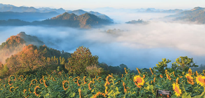 安徽省黄山市歙县霞坑镇石潭村,盛开的向日葵与高山云海相辉映。
