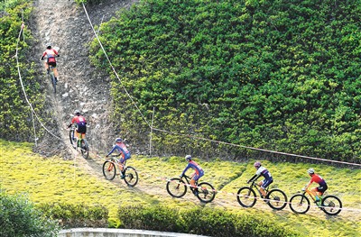 参赛选手在学青会女子山地自行车越野赛比赛中。 新华社记者 陆波岸摄
