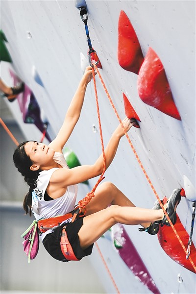 参赛选手在学青会攀岩项目比赛中。 新华社记者 曹祎铭摄