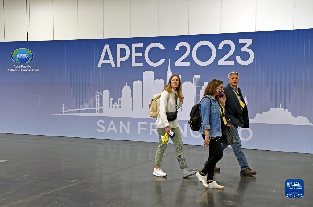 11月12日,在美国旧金山,记者经过2023年亚太经合组织会议国际媒体中心内的一幅海报。2023年亚太经合组织会议国际媒体中心已向注册记者开放。新华社记者 李睿 摄