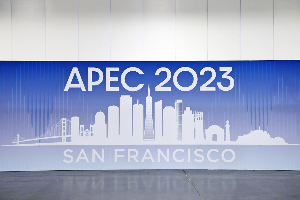 这是在美国旧金山拍摄的2023年亚太经合组织会议国际媒体中心的海报。