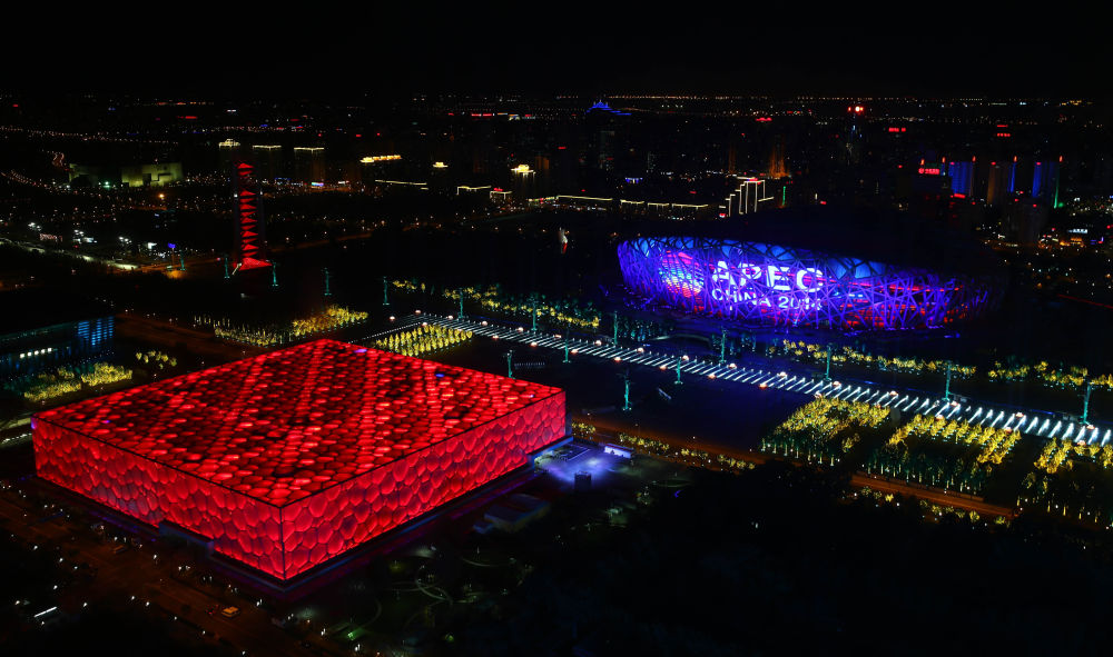 2014年11月6日晚拍摄的北京国家体育场“鸟巢”、北京国家游泳中心“水立方”及周边区域夜景。