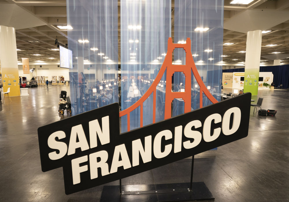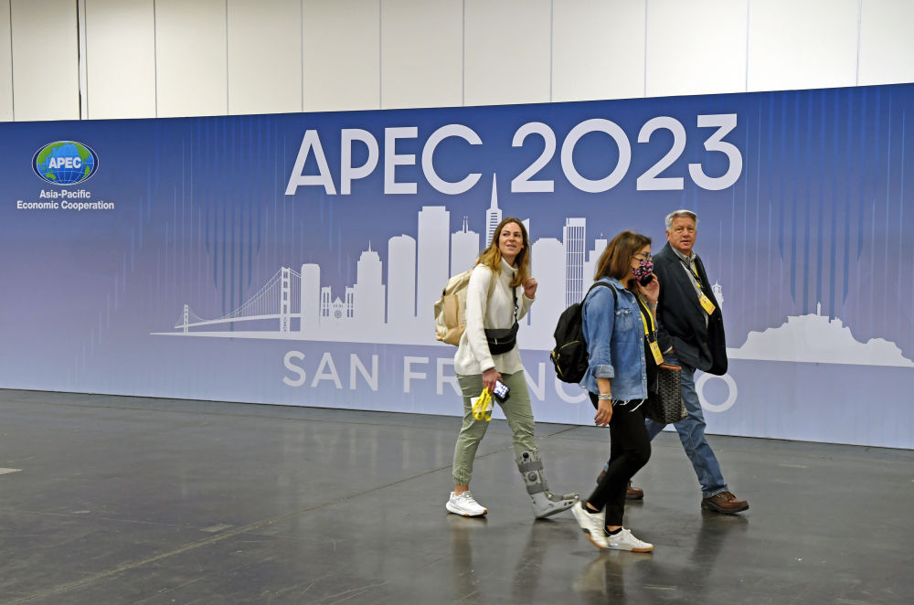 2023年11月12日,在美国旧金山,记者经过2023年亚太经合组织会议国际媒体中心内的一幅海报。
