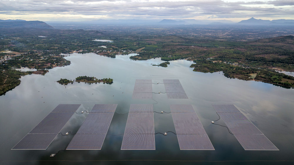 这是2022年12月8日在泰国乌汶府诗琳通水库拍摄的浮体光伏项目。