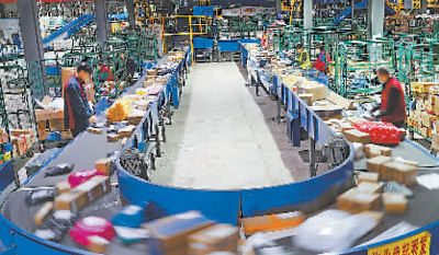 11月12日,在中国邮政集团有限公司衡阳邮区中心局邮件处理中心,工作人员分拣快递包裹。曹正平摄(人民图片)
