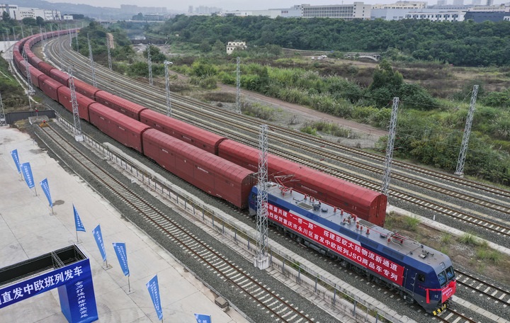 2023年11月14日,重庆市永川区首趟中欧班列JSQ商品车专列从永川栏杆滩站发车(无人机照片)。(王全超 摄)