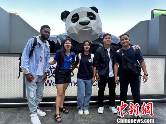 任瑞(左一)和其他留学生在成都。受访者供图