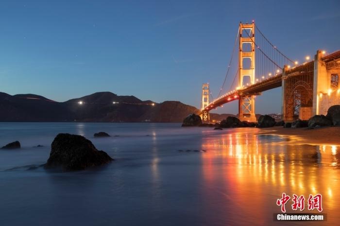 当地时间10月29日,美国旧金山金门大桥在海浪和夜色的衬托下美如一幅画。中新社记者 刘关关 摄