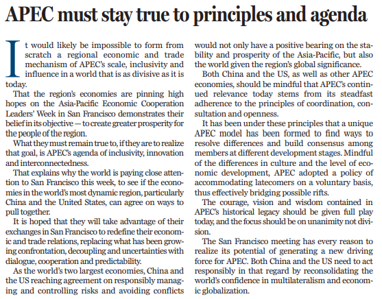 亚太经合组织发展历程中蕴含的勇气、远见和智慧应得到充分发扬,协商一致而非分裂对抗。在当今分歧重重的世界里,要从零开始建立一个像亚太经合组织这样规模、包容和有影响力的区域经济和贸易机制,基本是不可能的。旧金山会议完全有理由发挥其潜力,为亚太合作注入新动力,为地区乃至世界的发展与繁荣作出新贡献。