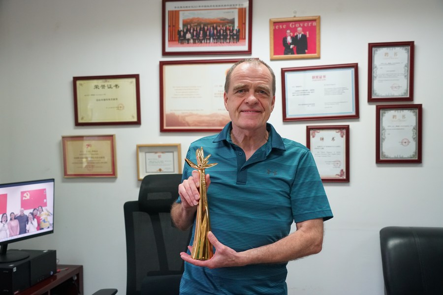 大卫·弗格森在办公室向记者展示他所获得的兰花奖奖杯。新华社记者 朱昊晨 摄