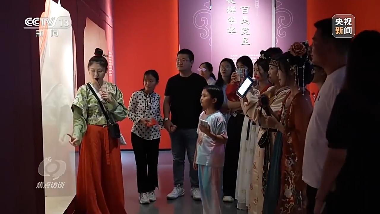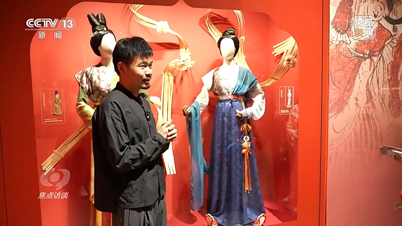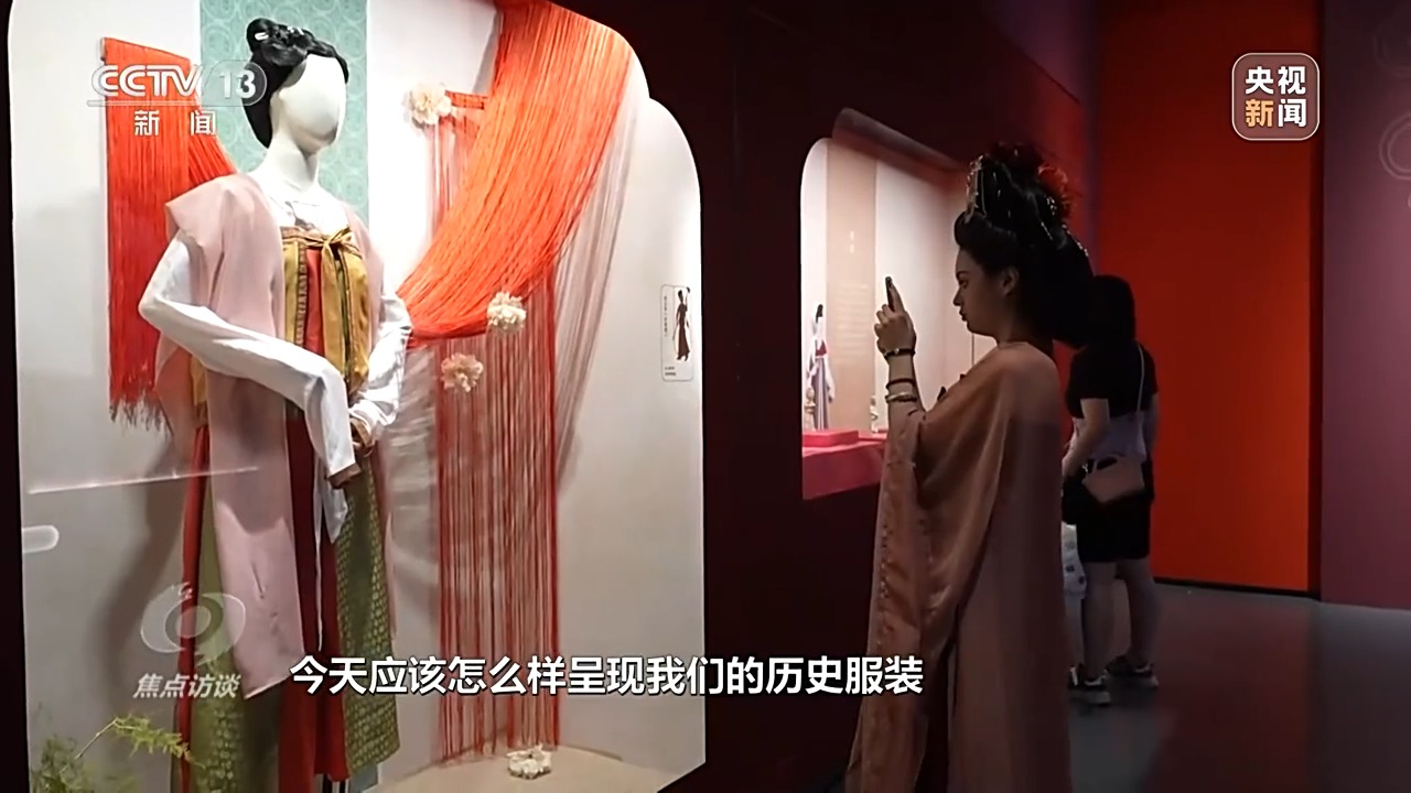 北京服装学院汉唐服饰研究中心副主任 陈诗宇:面料纺织、印染技术可以反射这个时代的艺术水平,服装上的纹样、颜色、色彩、花形也可以投射出这个时代的流行时尚、制度,包括经济水平是否比较开放、物质文化交流是不是丰富、海外影响是不是有更深入的交流,所以从服装本身就能够投射出很多在历史上方方面面的背景。今天,应该怎么样呈现历史服装,确实是有学术研究意义和现实意义的一项工作。