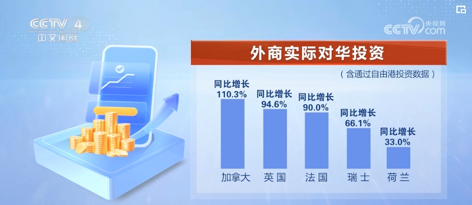 尽管部分指标出现波动,但外商来华投资热度不减。加拿大、英国、法国、瑞士、荷兰实际对华投资同比分别增长110.3%、94.6%、90%、66.1%、33%。
