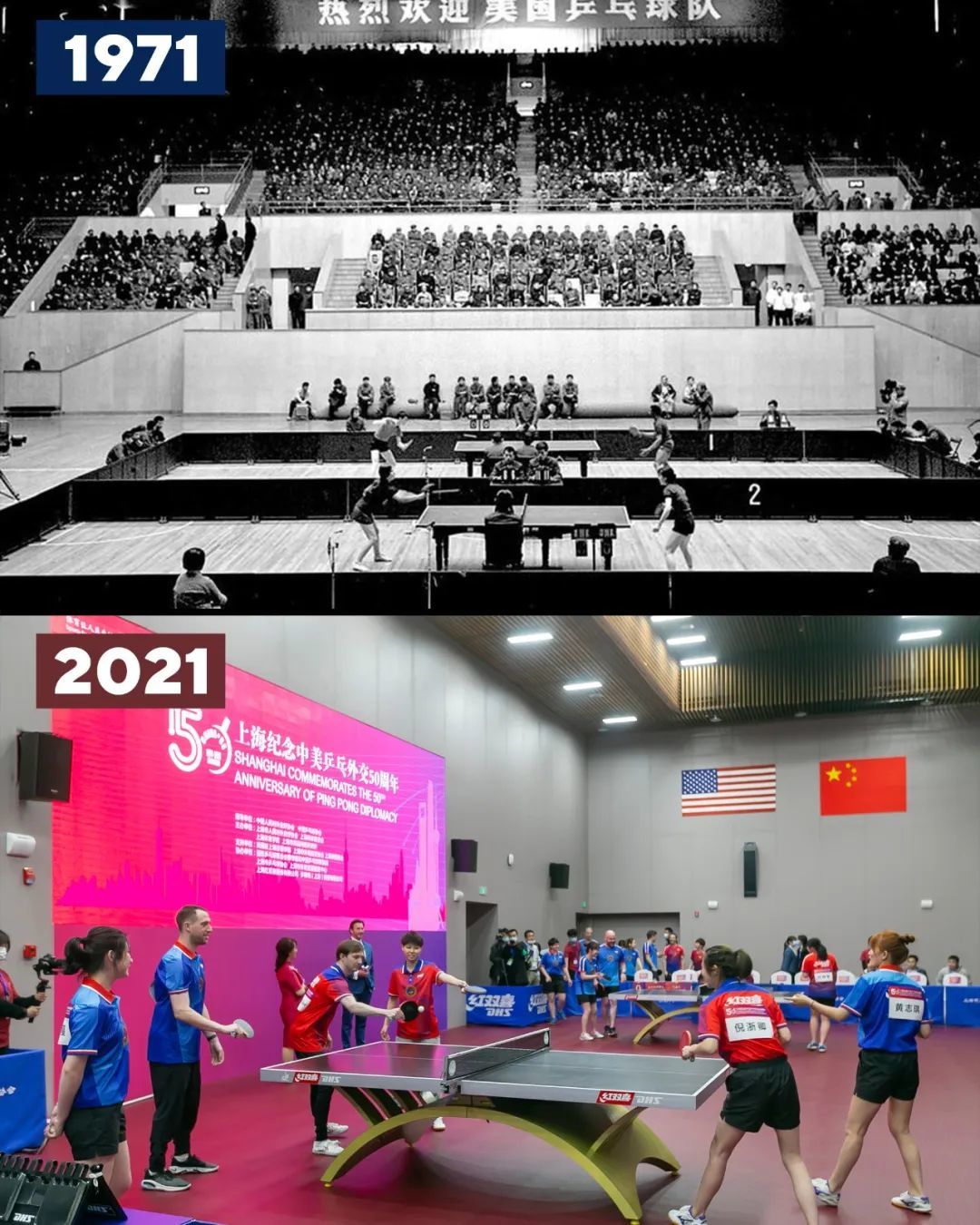 1971年4月,中华全国体育总会为访华的美国乒乓球代表团举行欢迎仪式。2021年4月,上海纪念中美乒乓外交50周年,中美选手参加乒乓球友谊赛。