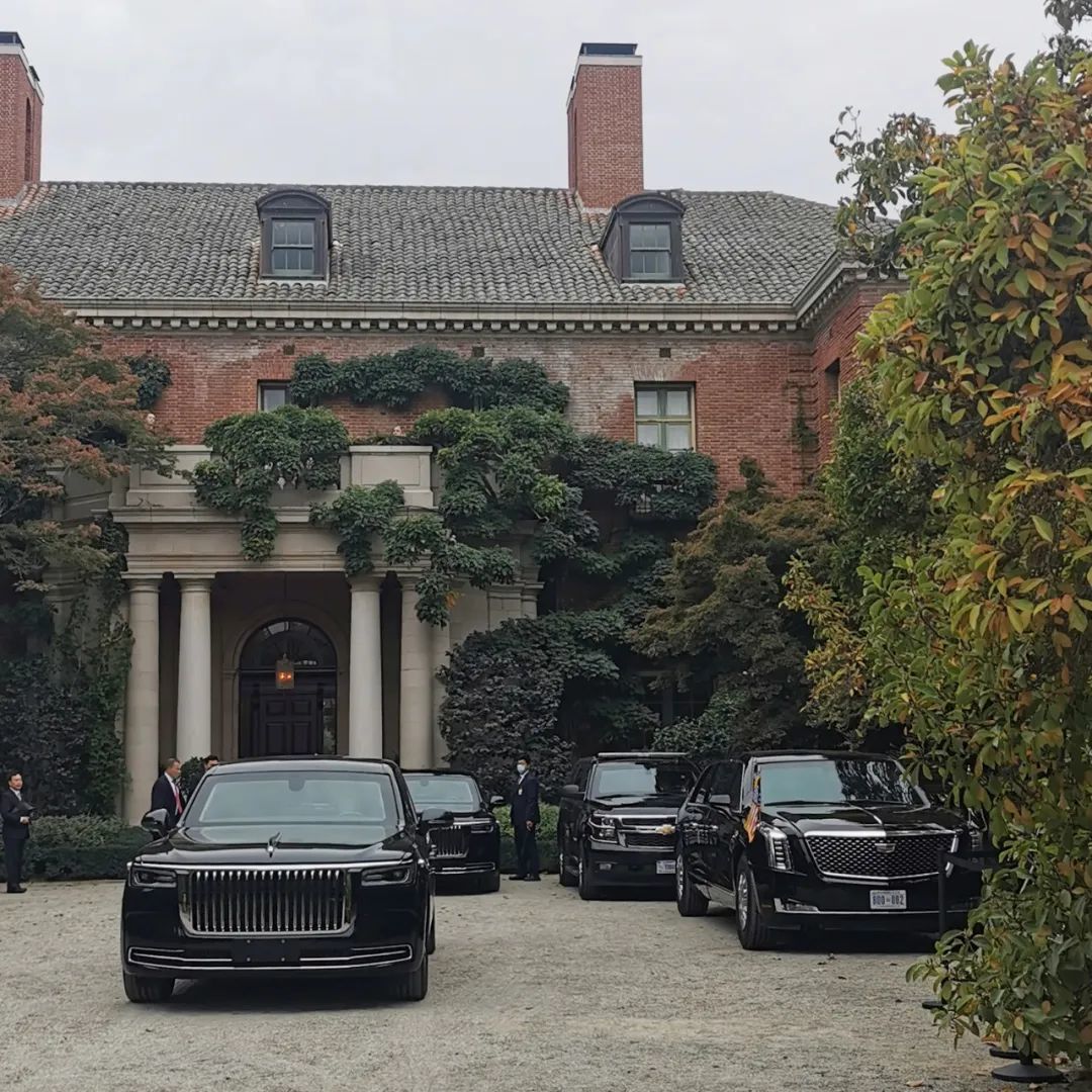 ▲ 中美元首旧金山会晤场地外,中国领导人的红旗轿车与美国总统的凯迪拉克“野兽”座驾并排停放。