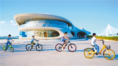 图为位于海口湾的世纪公园,小朋友在公园内骑行。