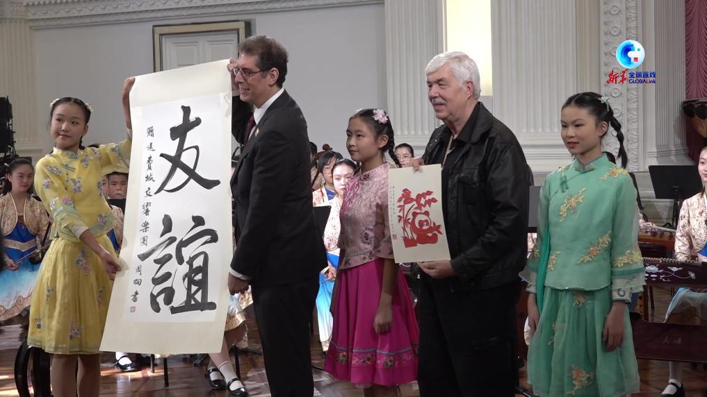两名少年儿童把在现场完成的写有“友谊”二字的书法作品和以熊猫为主题的剪纸作品,作为礼品赠送给费城交响乐团。