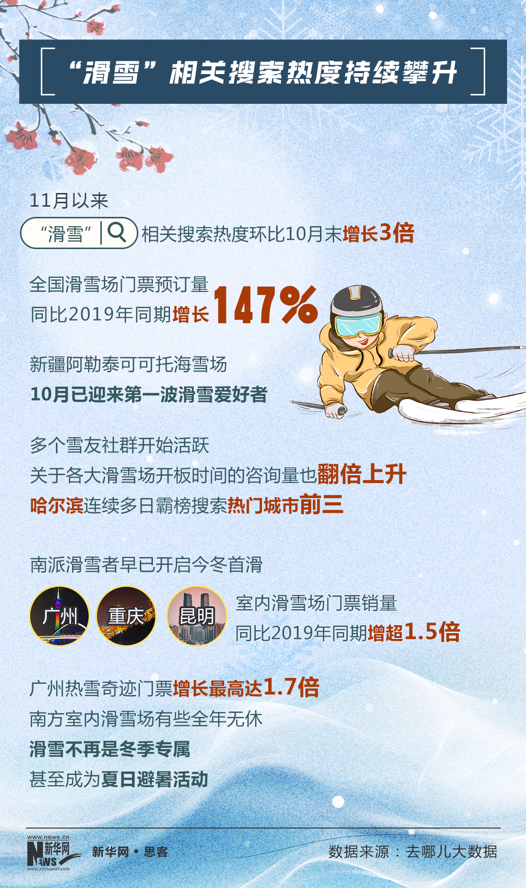 去哪儿大数据显示,新疆阿勒泰可可托海雪场早在10月已迎来第一波滑雪爱好者。11月以来,平台上“滑雪”相关搜索热度环比10月末增3倍,全国滑雪场门票预订量同比2019年同期增长147%。美团数据显示,11月1日至9日,滑雪门票团购订单量同比2019年同时期增长209%;携程数据显示,“滑雪”主题跟团游预订量同比去年增长近三成。