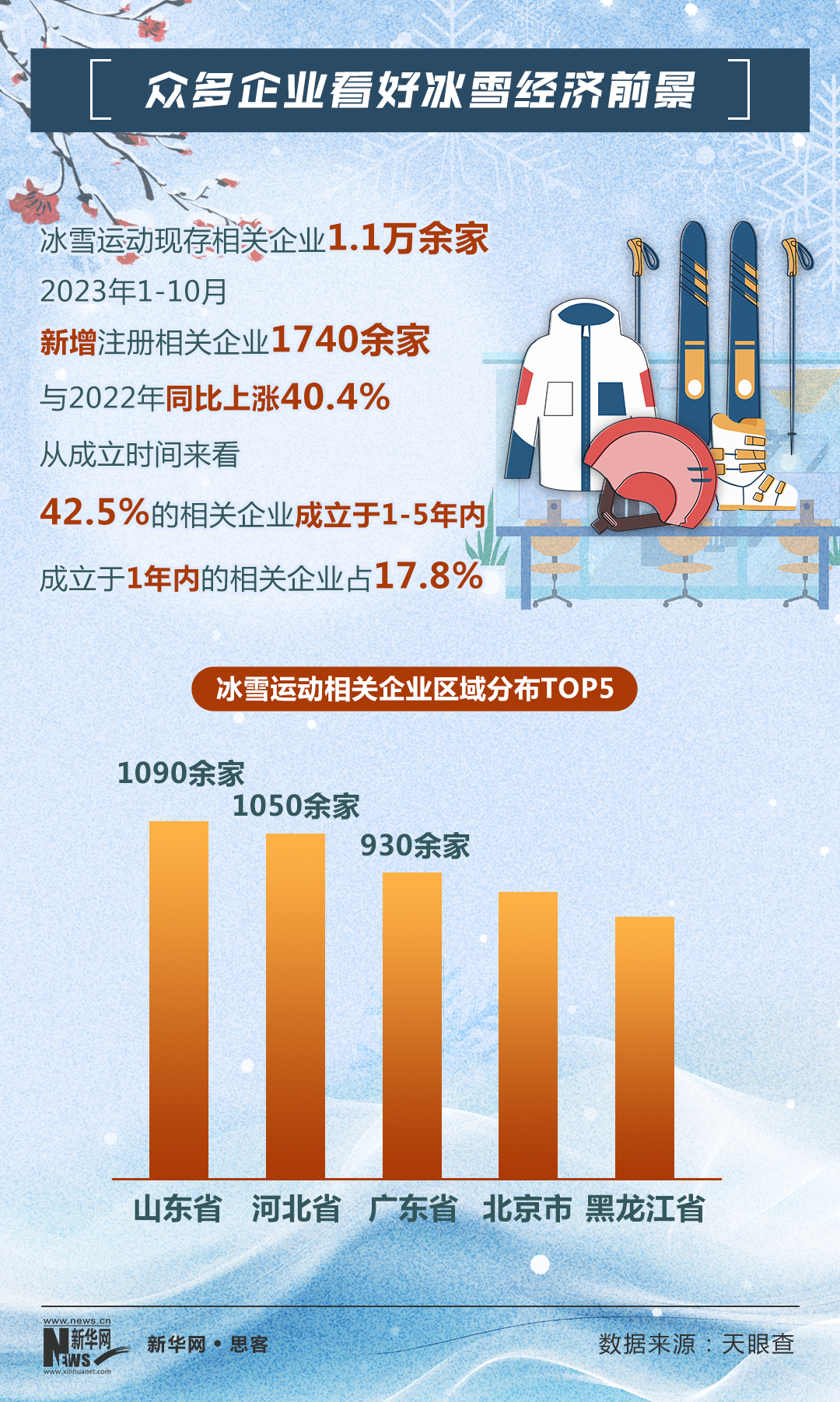 天眼查数据显示,截至目前,我国冰雪运动现存相关企业1.1万余家;其中,2023年1-10月,新增注册相关企业1740余家,与2022年同比上涨40.4%。
