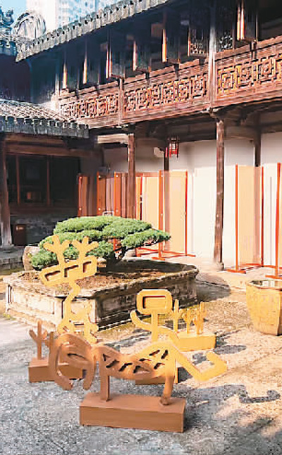 “龟甲牛骨上的精灵”甲骨文绘本展首展在浙江瑞安展出。图为展出的甲骨文装置。