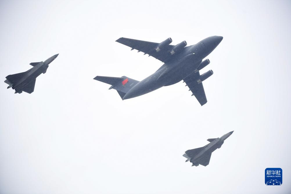 11月23日,空军两架歼-20飞机为护送烈士遗骸回国的运-20专机护航。新华社记者 潘昱龙 摄