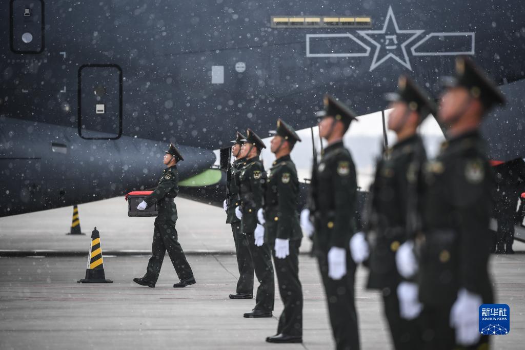 12时10分许,礼兵手捧烈士棺椁缓缓走下专机。这一刻,英雄们的灵柩终于踏上了祖国的土地。